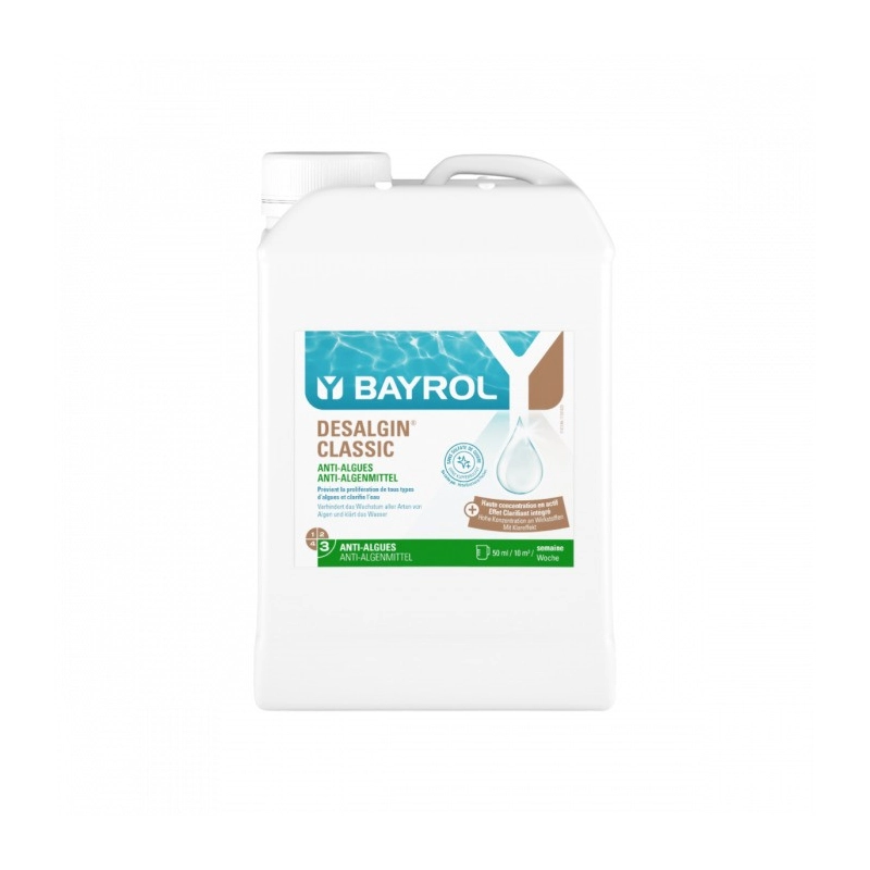 BAYROL Desalgin CLASSIC ist ein zuverlässiges Algenmittel zur Prävention und Entfernung von Algen im Pool. Schützt das Wasser langfristig vor Grünalgenbildung.
