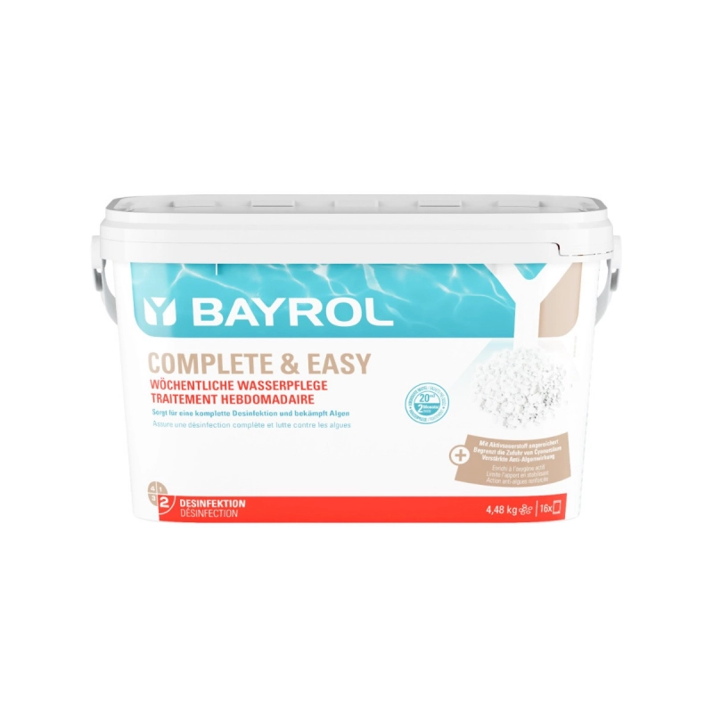 Entdecken Sie mit BAYROL Complete & Easy 4,48 kg die effektivste Rundum-Pflege für Ihr Poolwasser: leistungsstarke Desinfektion, zuverlässiger Algenschutz und brillanter Klareffekt alles in einem Produkt. Ideal für wöchentliche Pflege, einfache Dosierung und schnell wieder nutzbares Schwimmwasser schon 15 Minuten nach Anwendung.