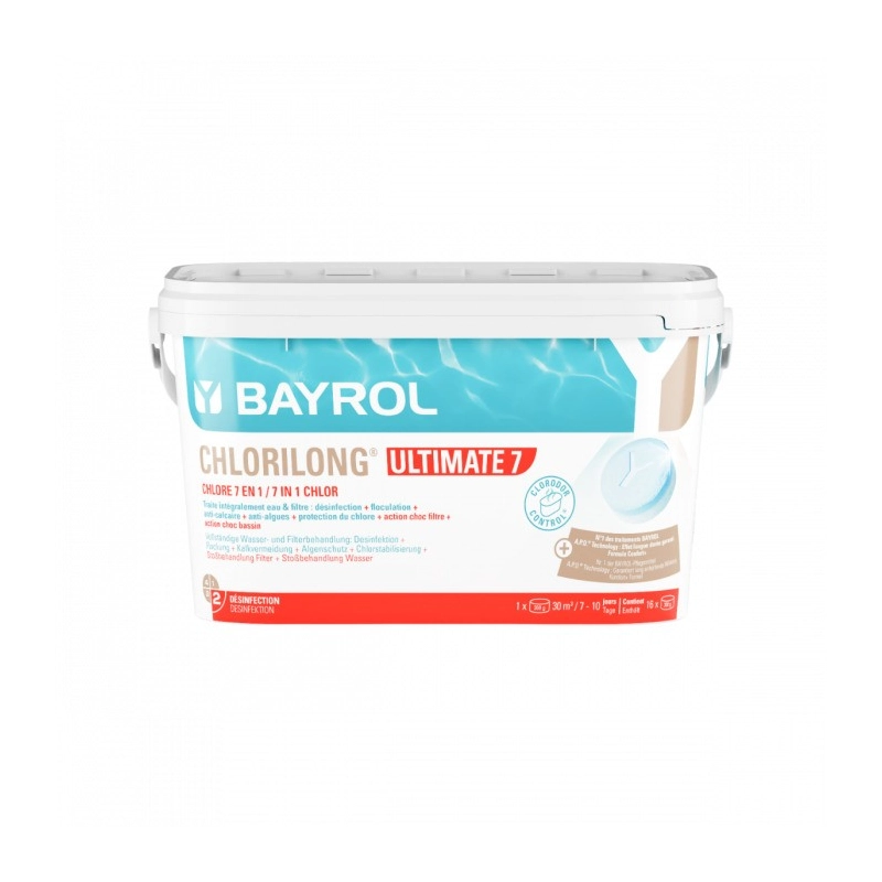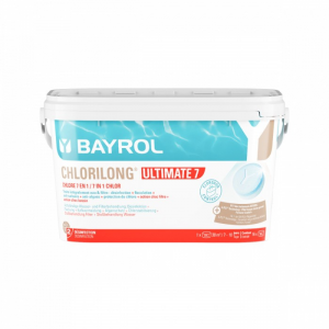 BAYROL Chlorilong ULTIMATE 7 ist eine 7-in-1 Multifunktion-Chlortablette für maximale Poolpflege. Desinfektion, Algenprävention, Kalkschutz, Trübungsentfernung, Chlorstabilisierung, Langzeitwirkung und UV-Schutz.