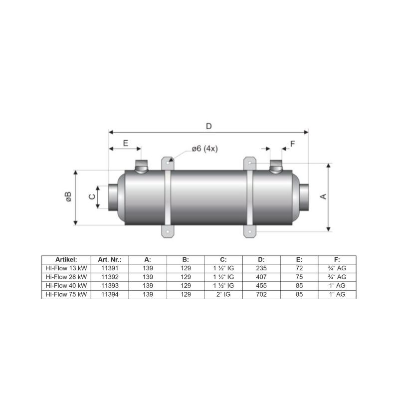 | Pahlén HI-FLOW 13 kW | 13 kW (11.000 kcal/h) | IG ¾" | IG 1 ½" |