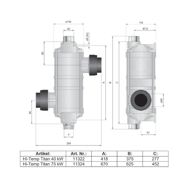 | HI-TEMP Titanium 40 kW | 34.000 kcal/h | 100 °C | Ø 50 mm Klebemuffen |