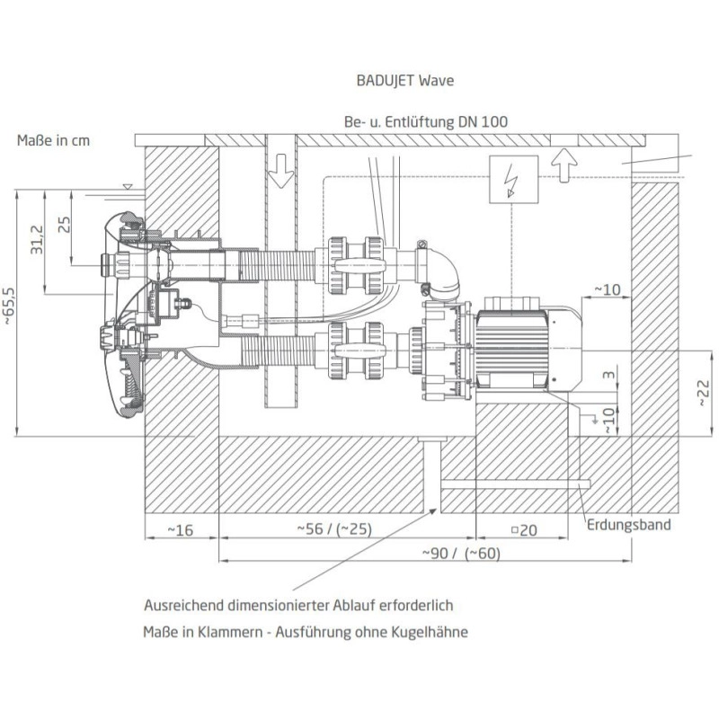 Die BaduJet Wave arbeitet über ein im Becken integriertes Gehäuse, das Wasser über Saug- und Druckleitungen ansaugt und über eine regulierbare Düse zurückführt. Diese Düse ist um 60° schwenkbar, sodass der Wasserstrahl optimal im Pool verteilt wird. Dadurch entsteht ein kraftvoller, gleichmäßiger Strom perfekt zum Trainieren, Entspannen oder Spielen.