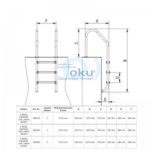 | OKU Einstiegsleiter 3-stufig | 500210 | 3 | Ø 42 mm | 265 mm | 1.320 mm | 490 mm | 250 mm | 150 mm | 500 mm |