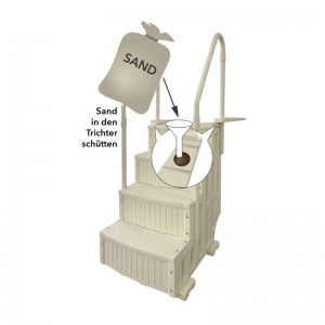 Da die Pooltreppe ohne Bohren oder Abdichten montiert wird, bleibt die Poolfolie vollständig unversehrt. Für einen festen Stand wird die Treppe einfach mit ca. 20 bis 30 kg Sand beschwert, um ein Aufschwimmen zu verhindern.