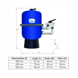 | Durchmesser | 600 mm | Sandfüllung ca. 125 kg optimal für größere Pools bis 60 m³. |