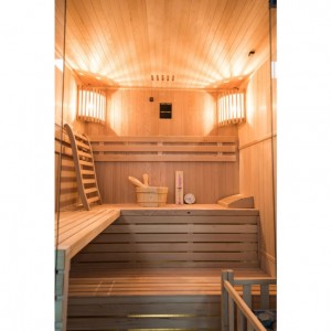 Die Dampfsauna Sense für 4 Personen vereint traditionelle Sauna-Technik mit modernem Komfort. Sie ist ideal für den Innenbereich oder überdachte Außenbereiche und bietet das authentische Gefühl eines echten Dampfbads direkt bei Ihnen zuhause. Ihr geräumiges Design, die ergonomischen Bänke und das edle Holz schaffen eine Atmosphäre der Ruhe und Erholung.