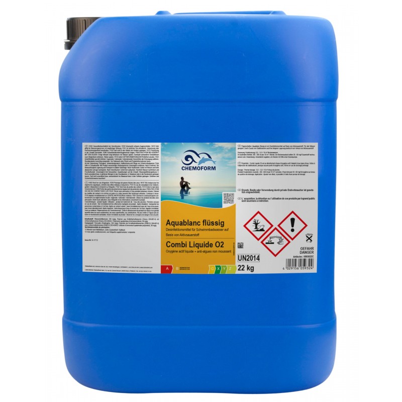 Aquablanc flüssig 12% ist ein flüssiges Aktivsauerstoffprodukt zur chlorfreien Desinfektion von Poolwasser.