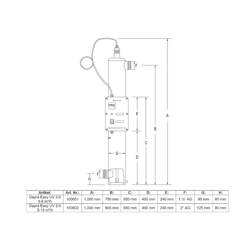 | Merkmal | Daprà Easy-UV-Gerät 2.0 4-8 m³/h | Daprà Easy-UV-Gerät 2.0 5-15 m³/h |